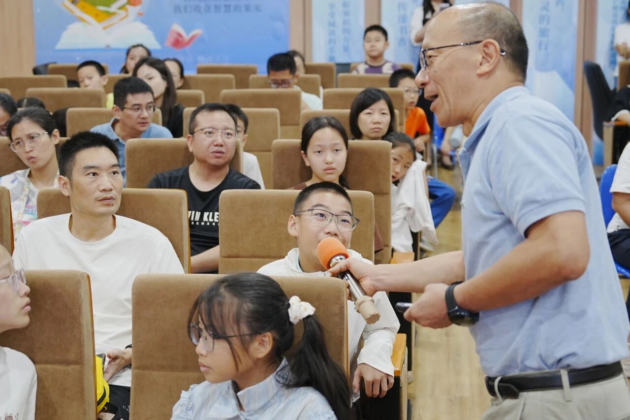 互动环节一开启,课堂氛围瞬间沸腾——陈教授的问题尚未说完,数十只稚嫩的小手已高高举起,眼中满是求知的热切。面对孩子们的热情,陈教授将复杂的科学原理转化为“听得懂、记得住”的通俗表达,让“海洋发光”这一抽象概念,化作孩子们心中可触可感的“光影魔法”,科学的种子在孩子们心中悄然发芽。