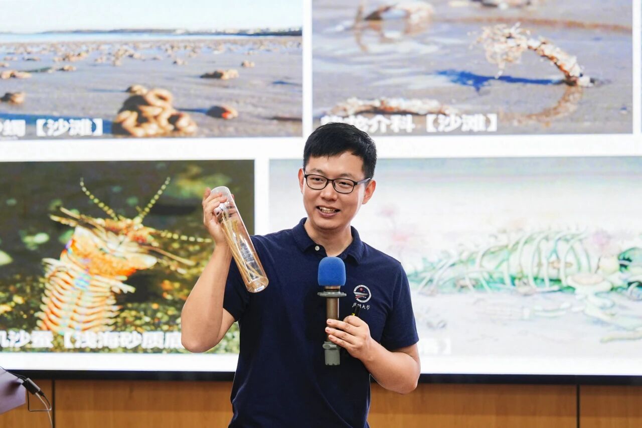王智副教授第二堂课由厦门大学海洋与地球学院王智副教授主讲《认识海洋底栖生物》,这堂充满“硬核”元素的课程,让孩子们沉浸式体验了科研的乐趣。与传统课堂不同,王老师的讲台俨然一座“海洋博物馆”:桌上整齐摆放着不同年代、不同种类的海洋生物化石,透明容器中多毛纲生物样本清晰可见,按比例还原的采泥器模型更是格外吸睛。这些独特的教具刚一亮相,便引发孩子们阵阵惊叹,好奇的目光紧紧追随着讲台上的每一件“宝贝”。