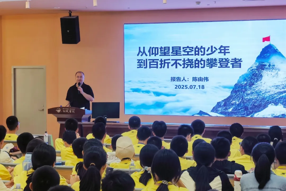 “1948 年,在英华中学的数学课上,15 岁的陈景润第一次听到‘哥德巴赫猜想’,这个关于‘偶数与素数’的谜题,成了他一生追逐的星辰。” 厦门市陈景润科学基金会理事长陈由伟以《从仰望星空的少年到百折不挠的攀登者》为题,为孩子们展开了一幅跨越近百年的科学画卷。