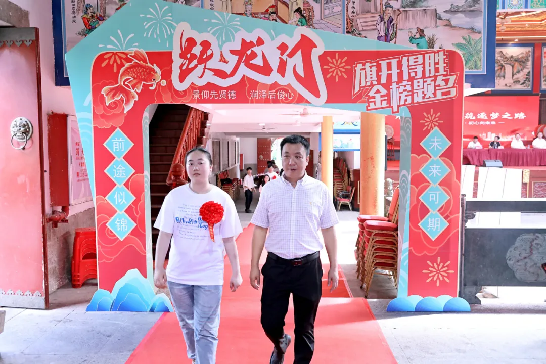 典礼以“入孝门·跃龙门”的仪式开篇,温情中透着深意。学子们挽着父母的手,缓缓从祠堂外的“孝门”步入,每一步都似在丈量养育之恩的厚度——那是父母鬓边的白发,是灯下缝补的牵挂,是家族代代相传的暖意,悄然在心底生根。穿过庭院,他们继而跃过堂内的“龙门”,这一跃,是十年寒窗换来的学业进阶,是人生新阶段的华丽序曲,更承载着乡邻们“望子成龙”的殷殷期盼。