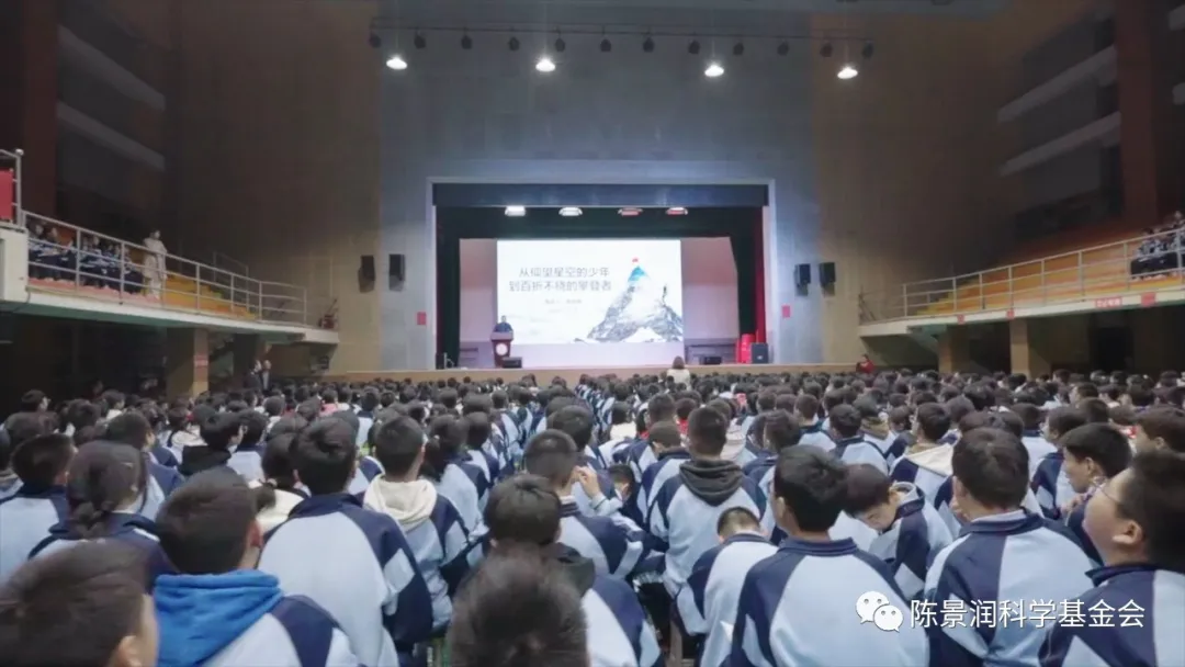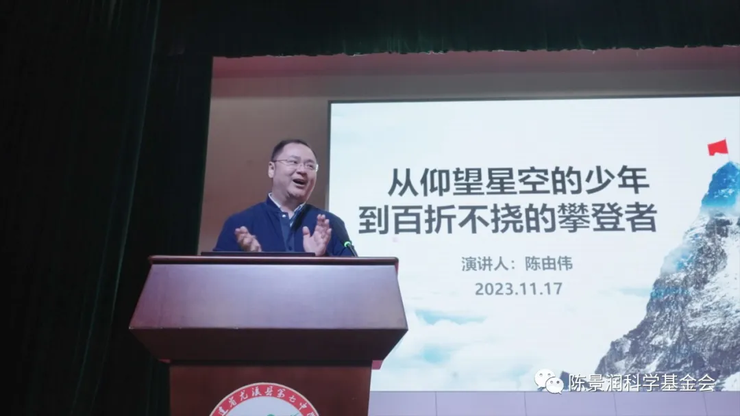 17日晚上,陈景润科学基金会理事长、陈景润先生之子陈由伟先生为尤溪七中的八百多名初一学子们带来了《从仰望星空的少年到百折不挠的攀登者》的主题演讲。陈由伟先生刚一登场,台下的孩子们就发出了异常热烈的欢呼。