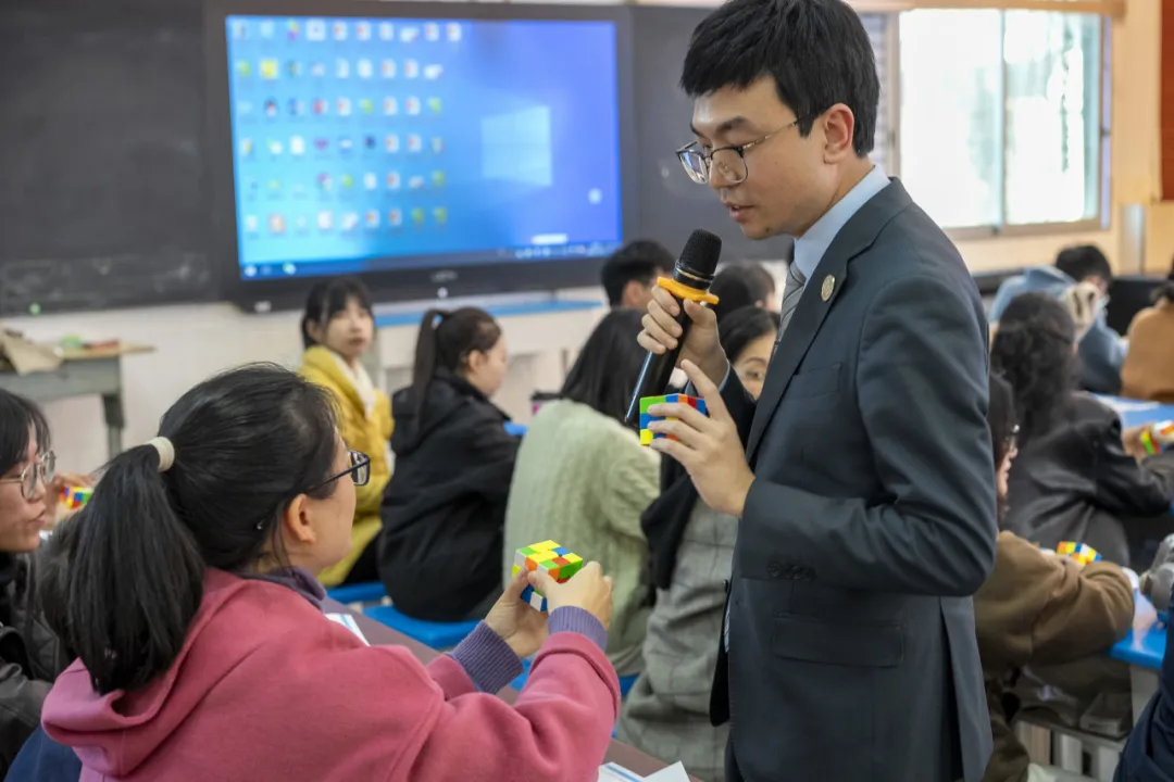 厦门魔方全能王、摇骰子单排叠高世界纪录保持者、解华容道“横刀立马”世界纪录保持者、水下憋气双人单手还原三阶魔方时间最快世界纪录保持者叶佳希老师与尤溪籍独立钻石世界记录保持者连萌圣老师则为小学中高段数学教师们带来了三阶魔方和汉诺塔课程。